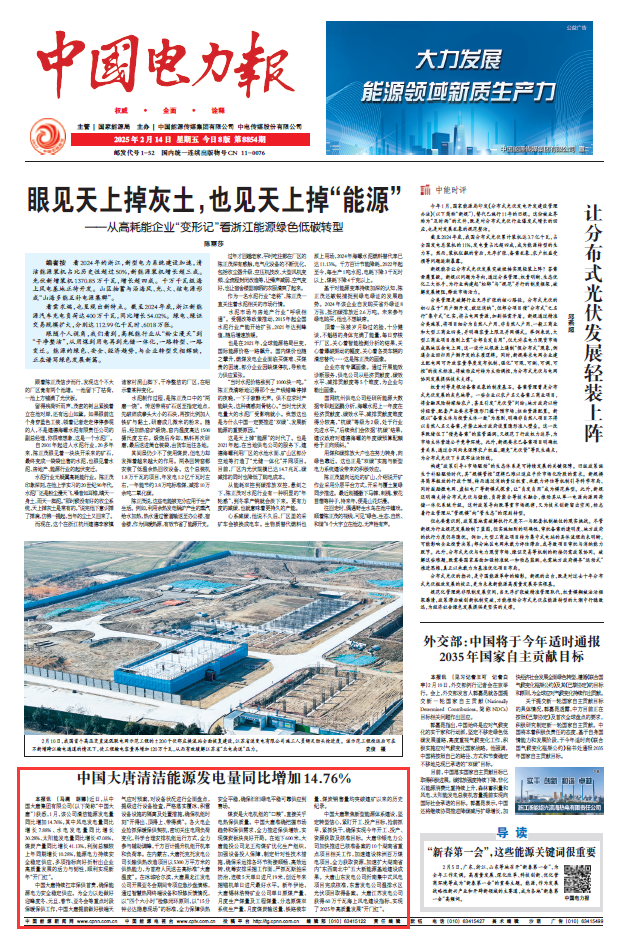 [中国电力报]中国大唐清洁能源发电量同比增长14.76%
