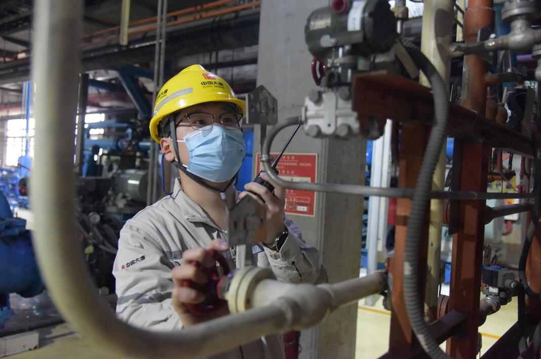发电部运行值班员靳博正在对发电机进行补氢