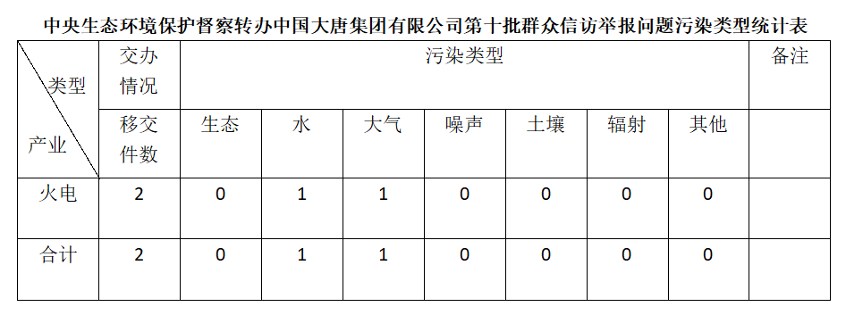 2025年6月13日,中央第七生态环境保护督察组向中国大唐集团有限公司移交第十批群众信访举报件,共计2件,均为来电举报,涉及水问题1个、大气问题1个。所有举报件办理工作已第一时间进入调查核实办理程序,办理情况将按照相关要求反馈督察组,并及时向社会公开。